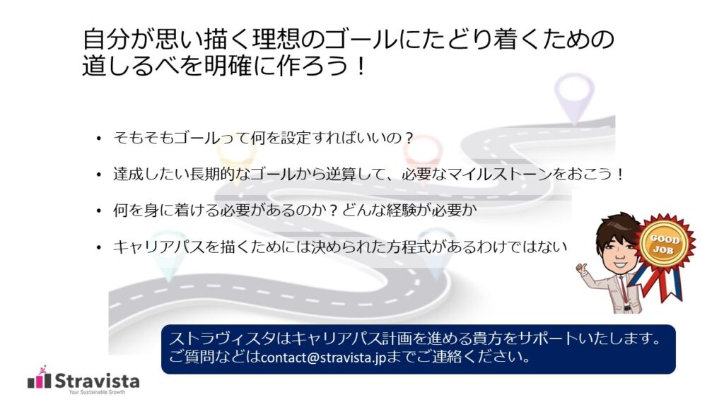将来自分がなりたい自分になるためのルートに自分は乗っているのか?これを問い続けることでおのずと最適なキャリアパスを歩めるのではないかと思います。ストラヴィスタはそんなキャリアパス計画を進める貴方をサポートいたします。ご質問などはcontact@stravista.jpまでご連絡ください。