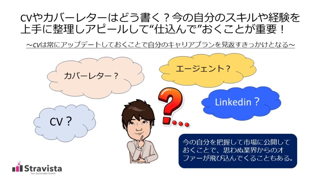 こうなると、「CVってどうやって作成すればいいの?」という質問が出てくるが、それはまた後日、転職時期と合わせてお話ししたい。